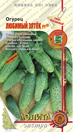 Новый очень ранний самоопыляемый партенокарпический гибрид. Для открытого грунта, пленочных укрытий и стеклянных теплиц. Отличается очень высокой урожайностью, длительным периодом плодоношения и товарностью плодов. Очень устойчив к основным болезням огурца: вирусу огуречной мозаики, настоящей мучнистой росе, оливковой пятнистости, высоко толерантен к ложной мучнистой росе. Плети растения средних размеров. Зеленцы крупнобугорчатые, насыщенно-зеленые, овально- цилиндрической формы. Масса зеленца – 80-95г, длина 7,5-9 см, соотношение длины к диаметру – 3,3:1. Вкусовые качества превосходные, горечи не содержит. Рекомендован для употребления в свежем виде, консервирования и засолки. Компания «АЭЛИТА» является эксклюзивным продавцом семян гибрида огурца «ЛЮБИМЫЙ ЗЯТЁК F1»® на рынке семян.